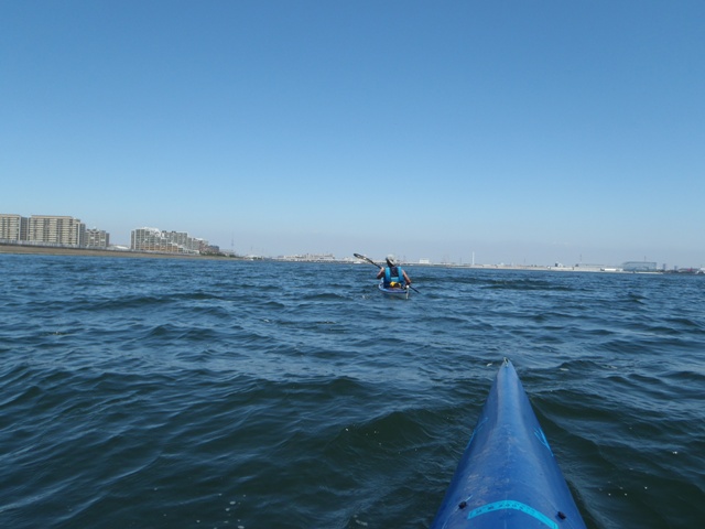 午後、疲れた頃に、最後、東京湾に出ると、案の定、風が強まり、少々、海が荒れていた。追い風の中、漕いでいた。